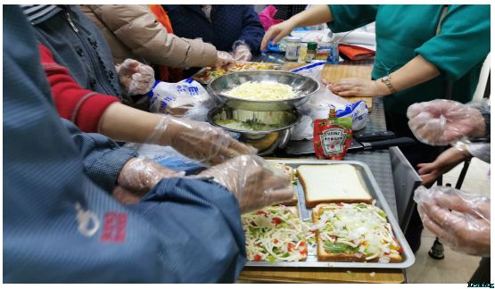 打开烤箱预热一分钟,社工和老师将大家亲手制作的披萨放进烤箱,与此同时,大家已经迫不及待的开始了第二批披萨制作。“首先要刷上番茄酱,然后放芝士、蔬菜、培根和玉米粒,再铺上一层芝士就齐活了!”“大哥您记性可真好哎,都能给我们当老师了!”在一片欢声笑语中,第一盘披萨的香味已经飘满了整个贞爱之家。大家不分你我的开始切和品尝披萨,配上提前煮上的红薯小米粥,那叫一个美味啊!