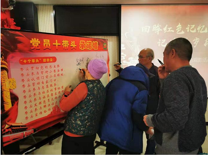 观影结束后,社工邀请居民骨干向大家宣读“党员十带头”的内容,并组织大家共同在社区“党员十带头”承诺墙上签字承诺,践行党员“不忘初心,牢记使命”的历史重任。宣誓后社工为每一位居民发放了一份红色故事征集单,希望借助影片唤醒居民们对红色故事的记忆,积极分享社区内感动人心的榜样人物与事件。
