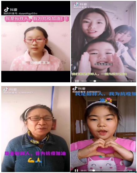 “武汉加油,中国加油”、“抗击疫情、人人有责”、“武汉不孤单,我们心在一起”等呼声频频在大家的作品中呈现,有的用歌声表达对疫情早日结束的期盼;有的用言语表明抗击疫情的决心;有的用舞蹈向奋战在一线的医护人员致敬;还有的创作顺口溜倡导大家做好防护;全家老小总动员,为抗疫防疫发声。