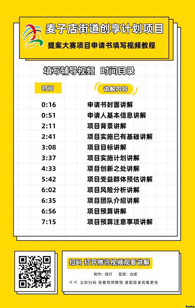 申请书撰写辅导讲解视频包含了项目封面填写、申请人基本信息填写和项目情况介绍填写三大板块,以及十个方面的思路提示和撰写示范。立德社工制作了目录索引,居民填写到哪个主题遇到问题时,可以根据目录到指定的时间去观看该主题的撰写讲解。例如: 您想看项目预算填写的讲解,您可以直接滑动视频到6分56秒处观看。