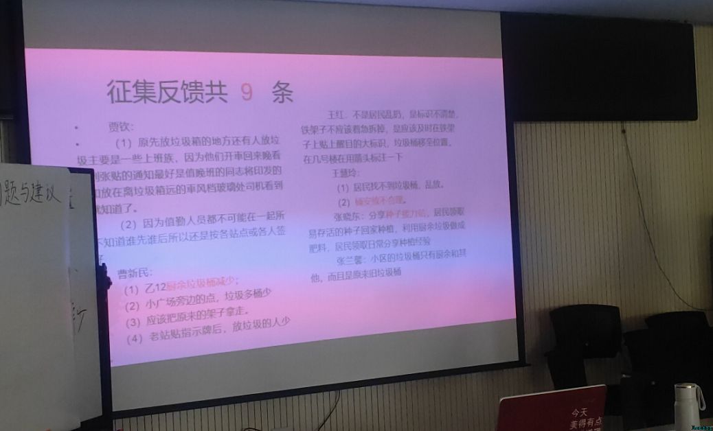 本次垃圾分类促进员月度工作总结会圆满结束,与会者近十人,征集有效建议共7条。总结会的举办一方面总结和表彰促进员上月度的工作,有利于增强他们的工作信心与积极性;另一方面为下月度的工作征集到有效的建议,为工作改进指明了方向。下一步裕祥花园社区将进一步规范队伍运行,发挥促进员的宣传与倡导作用,将垃圾分类工作做实、做到位。