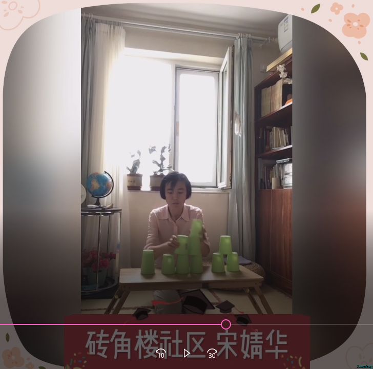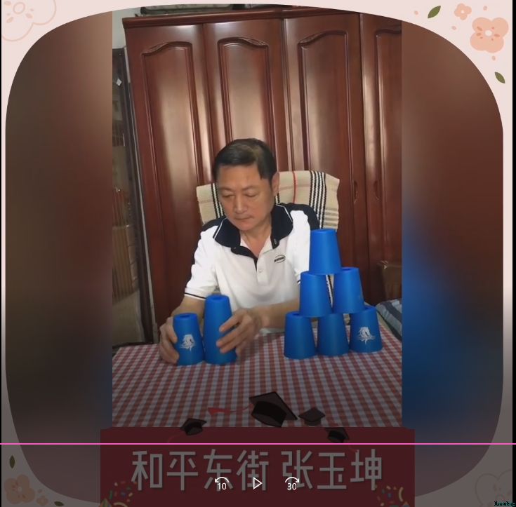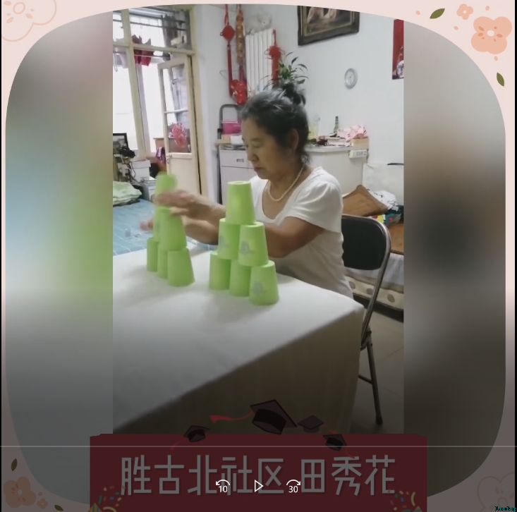 近日,“和平街街道叠杯常乐打卡”微信群迎来了最后一期活动——线上竞技叠杯赛:参赛人员要完成叠叠杯3—6—3全套动作,用时越短名次越高。不一会的功夫,大家就纷纷上传了自己的参赛视频。只见参赛选手们左右手交替起落,桌上的12只塑料杯一会儿被叠成小金字塔形,一会儿又被收成柱形,一会儿又被叠成大金字塔形。这样快速熟练的手法,伴随着杯子摩擦产生的悦耳声音,令人眼花缭乱,赞叹不已。