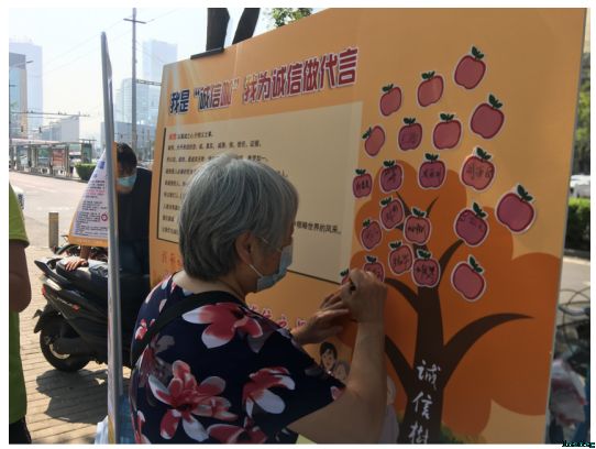 参与者纷纷在诚信书上贴上诚信小苹果,表示讲诚信之事,行诚信之举。为期两个小时的外展征集活动关注度达到100余人,问卷填写率在60%以上,明确表示愿意参与后期活动的达10人。