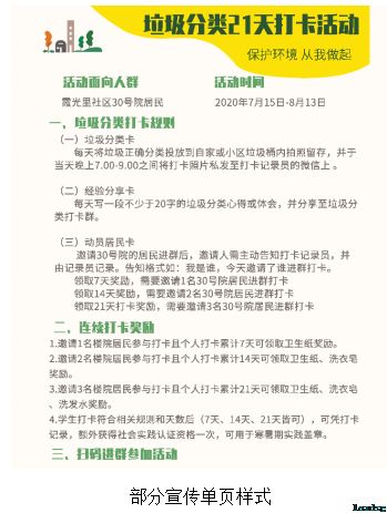 本次活动周期为30天,居民只需完成7天、14天、21天的三类打卡(垃圾分类打卡、经验分享打卡、居民动员打卡),即可在活动结束后兑换相应的奖励。
