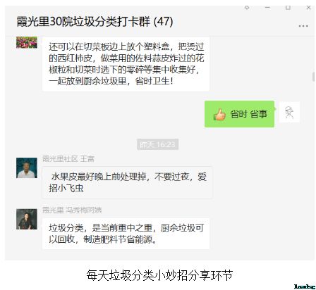 每天30号院居民都可以定时在群里分享自己的或者网上学习到的垃圾分类小妙招、小窍门,供大家在群里交流、学习,让垃圾分类变得更简单、更省事。