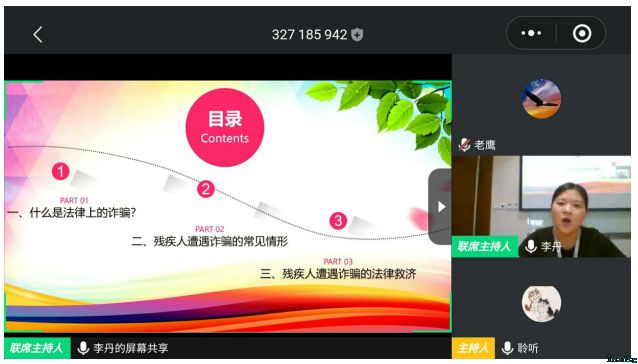 李律师以线上宣讲和案例分析相结合,辅之以视频,向残障朋友们详细分析了冒充熟人或公安、贸易公司、促销活动、捡钱分钱等诈骗形式和作案特点,让大家深刻意识到诈骗手段的多样性及越来越隐蔽性。李律师还进一步为大家普及了被诈骗后如何求助和减小损失。