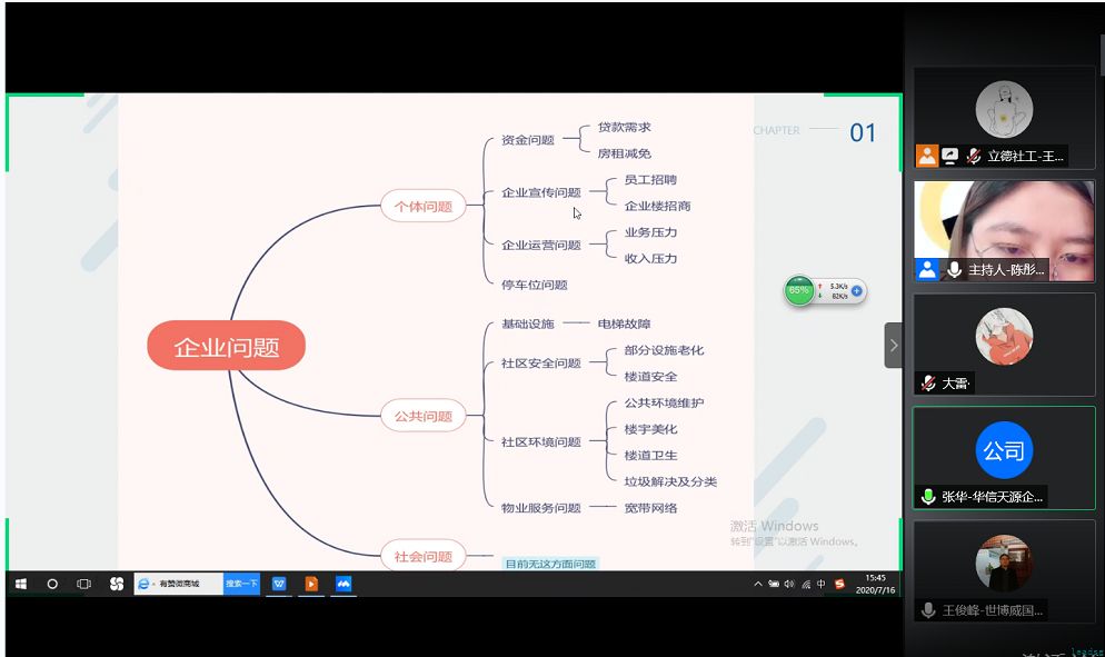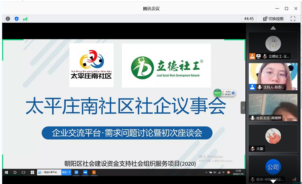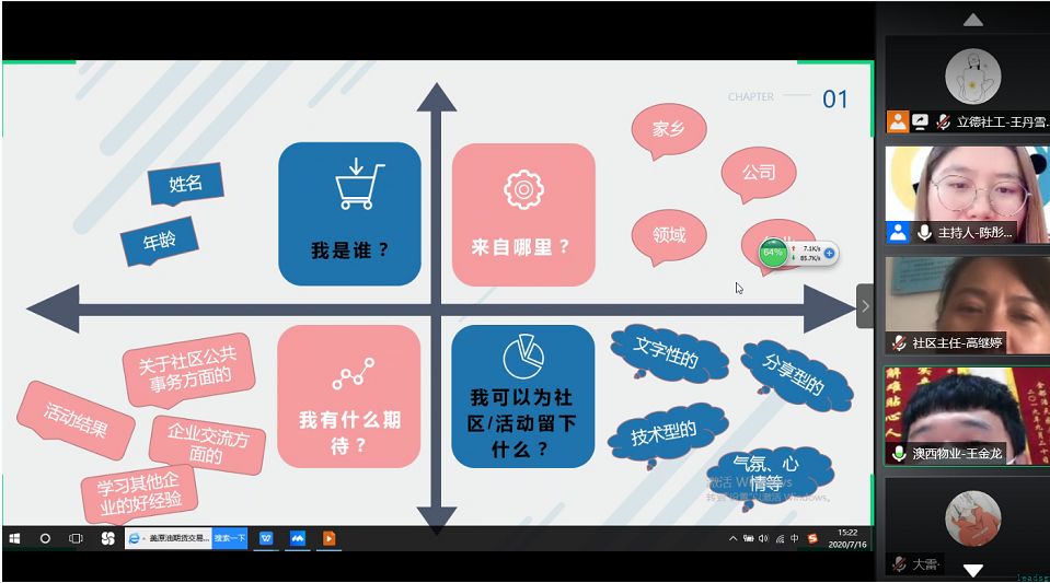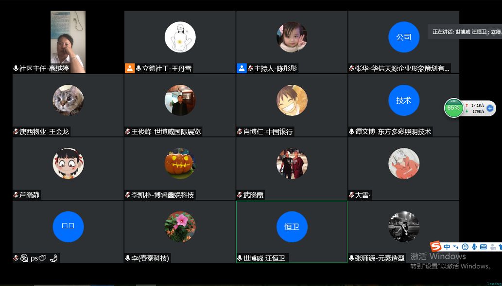 应疫情防控要求,2020年7月16日下午,立德社工在线上组织了太平庄南社区企业需求问题讨论会。参与本次社企议事的分别有太平庄南社区领导、澳西物业代表、北京世博威国际展览有限公司、北京博睿鑫娱科技有限公司、春泰科技(北京)有限公司等十余家企业代表。太平庄南社区主任高继婷表示:社会治理是一门科学,社区是社会治理的基础单元,而企业作为商务楼宇社区的一部分,对推进社区治理工作发挥着至关重要的作用;社区也会始终坚持以企业需求为导向,积极探索企业与社区融合发展的有效路径。