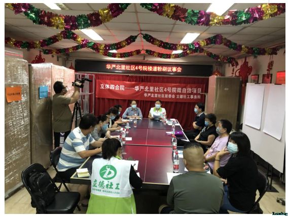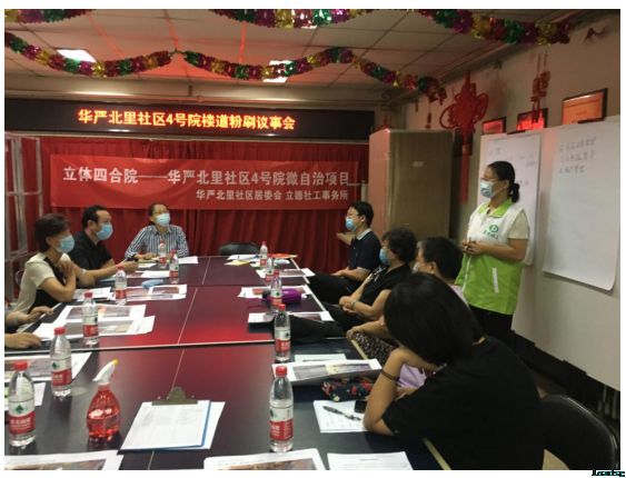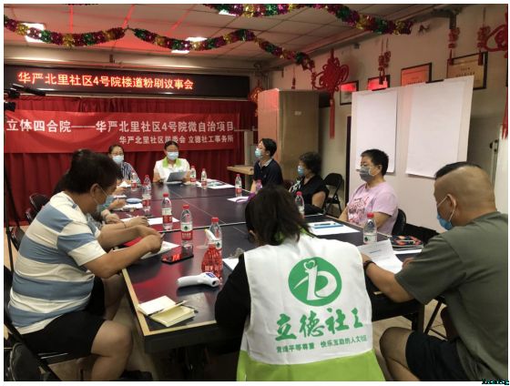 楼道粉刷议题是2020年朝阳区政府购买社会组织服务项目——《立体四合院——华严北里4号院微自治项目》的一部分,本次会议参会各方将就楼道粉刷注意事项、楼道粉刷方案、楼道粉刷后的维护三个方面进行交流与讨论。