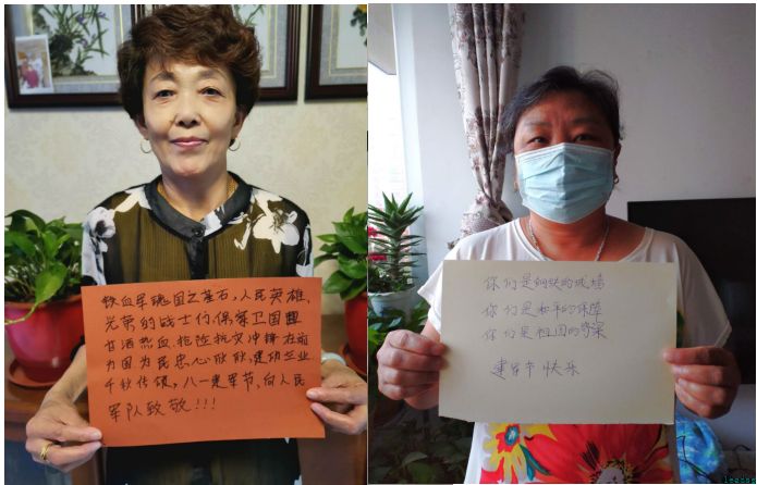 地区残障朋友用自己独特的方式向军人致敬!“回顾光辉历程,珍惜现有生活,致敬最可爱的人!”“祝愿我们的祖国繁荣昌盛,谢谢解放军战士的守护”。
