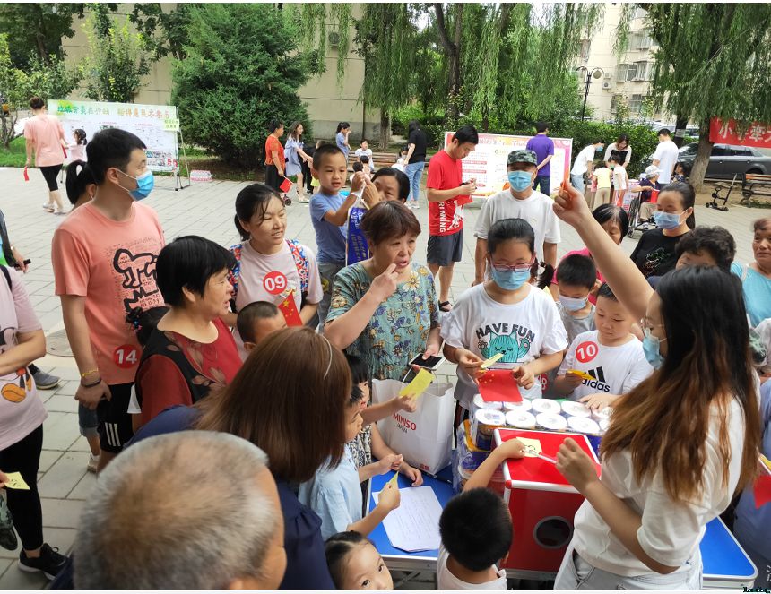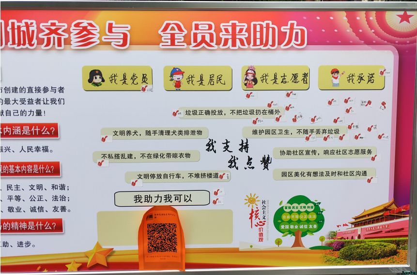 现场参与活动的除了党员、志愿者外,还有众多参与线上21天垃圾分类打卡的居民朋友们;大家签到入场并领取属于自己的号码牌,参与群体覆盖老中青少四代,场面热闹非凡。最为热闹的区域便是文明创城承诺墙,许多青年骨干纷纷在承诺墙上用点赞贴纸选择自己支持的文明创城行为,并扫码进入社区青年骨干群,表示要为今后的文明养犬做宣传,为楼门美化等议题建言献策,积极助力社区共建美好家园。