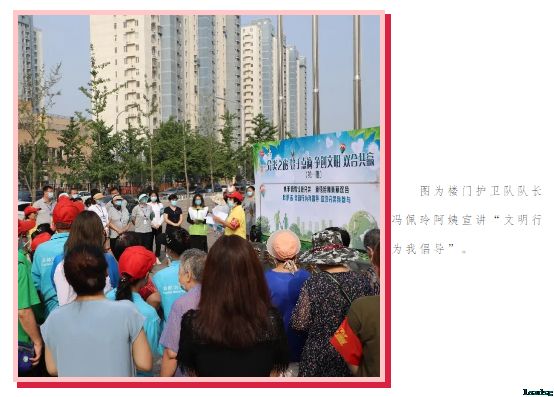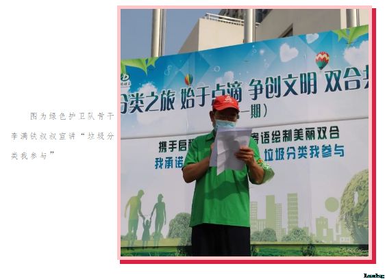 接下来进行活动宣讲,邀请到双合家园“优美环境”的守护者。楼门护卫队队长冯佩玲阿姨宣讲“文明行为我倡导”,绿色护卫队骨干李满铁叔叔宣讲“垃圾分类我参与”。宣讲过后,所有到场人员,在背景板下集体合影,共同承诺,共同践行,共同参与,然后签名、留言。