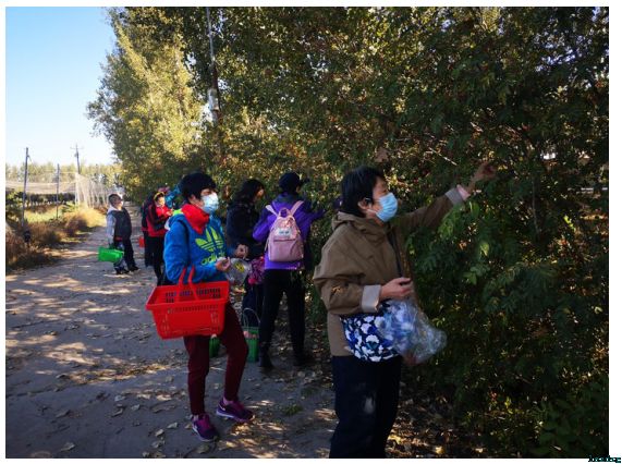 22日一早,在社工的组织带领下,一行人乘车前往房山区金冠采摘园,车上也提醒大家采摘时注意安全,佩戴好口罩。大家在果园门前集体合影后领取了采摘工具,去往采摘的路上,社工为大家介绍了苹果的生长环境及种植的相关知识,并强调采摘时的注意事项,叮嘱大家注意安全。