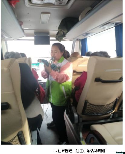 采摘当天,大家早早地来到了温馨家园报到,怀着轻松愉悦的心情乘坐大巴车前往苹果园,一路上大家兴致勃勃、欢笑不断,满心期待着今天的活动。在下车之前社工讲解了采摘规则及注意事项,并提醒大家注意疫情防控及人身安全。