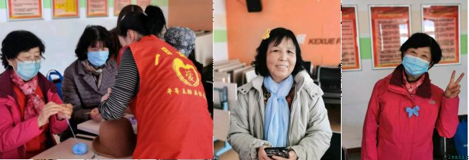第二天的课程是“一日女儿”队伍中的志愿者自发来做小老师。老师是第一次来给老人们授课,却有着难得的耐心和细致。彩色的毛线在阿姨们的手里被赋予了生命,可爱的小蝴蝶配上阿姨们的笑脸意外的相配。