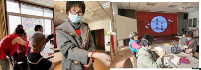 最后一堂课是喜庆的红色绳结手链教学。“一日女儿”志愿者们依然陪伴在每位阿姨身边,协助老师手把手教给阿姨们绳结的打法。红绳在阿姨们手上逐渐合为一条,每一个绳结里都有她们对手链主人的祝福,可爱的金色吊坠衬得阿姨们仿佛更年轻了些。