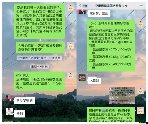 本周一,空港温馨家园通过微信活动群开展了“食品安全为先”第一期《食用油和调料的选购》科普活动。从厨房用品出发,分享了酱油、食醋、料酒等挑选标准,以及根据食用植物油的特点如何去选择适合自己用油的技巧:一定要多留意商品的标签信息。小课堂结束后,社工为大家发布了“课后作业”,70%的服务对象都掌握了食用油和调料的选购技巧,一位张大爷看完这些内容说自己家的食用油该换个种类了。