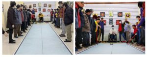李老师将现场残疾人朋友分为两支队伍,每队4名成员,比赛时每人投掷1次,依次轮流。当红色冰壶滑过赛道,冲向圆心时,下一位比赛选手已提前准备好;当坐在轮椅的那一刻,沉着冷静予以出击。在动与静的结合下,黄色冰壶与红色冰壶完美碰撞,令在场的人们惊呼“好球”!