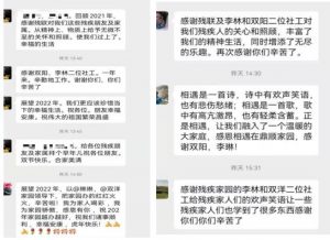 活动结束后,社工将大家的愿望贴纸做成了一道展示墙,希望将大家美好的祝福予以传递。除此之外,一些无法来到温馨家园参与活动的人员,也在微信群中描绘了心中愿景,并对残联与温馨家园及社工这一年来的关爱表示感谢。