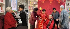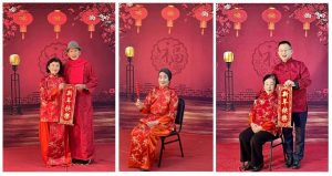 经过公众号与微信群多方宣传后,许多老年朋友与家人一起来到社区图书室,在摄影协会志愿者的帮助下换上唐装,然后端坐在镜头前摆好pose,加上红色喜庆背景以及灯光的映衬,留下了一张张幸福而又精致美好的照片。