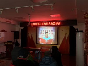 接下来是宣讲社区榜样人物。现场所有人看了视频之后颇有感触,一致认为宣传社区正能量,弘扬传统美德,是构建美好和谐社区的需要,是当下社会所倡导的新风尚。