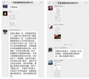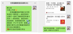 社工通过线上微信活动群分享《开国大典红灯笼》、《党史百年天天读》两篇文章。前者介绍了开国大典天安门上悬挂的八盏大红灯笼,现收藏于香山革命纪念馆。这些灯笼不仅仅是中华民族绵延数千年的灿烂文化的象征,更沉淀了岁月的痕迹,承载着历史的厚重,见证了那段开天辟地、波澜壮阔的历史时刻,将永载史册,被世人铭记!后者为大家讲述了历年5月16日所记录的事件,比如毛主席为《解放日报》撰写发刊词指出:全国一切抗日人民必须团结起来!这不禁让人想到中国共产党始终是站在斗争前线的,过去如此,现在如此,将来还是如此!