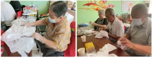 待学员陆续到齐后,社工将手工所需材料发下去,然后开始给大家介绍扎染工艺的基本知识、扎染特点和制作技巧等,大家听得非常认真,并表现出很大的兴趣。在社工的指导下,学员们首先将白色的方巾、半袖浸湿拧干,然后把弹珠、形状各样的卡板、雪糕棒等小物件包进方巾,最后用皮筋、线绳扎起来,搭配上挑选好的颜料放到密封袋中。这样,舒展的白布变成了一个个小团团。虽然是初次尝试,但大家都兴致很高,充满创意,兼顾自己的同时还不忘为身边的朋友出谋划策,欢声笑语下是如此的和谐、温馨。