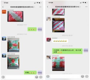 首先将一块纯白色的布料均匀打湿,然后通过不同的技法,将其扎成花形、正方形、条纹形等多种形状,并用皮筋扎紧固定,最后涂染上自己喜欢的色彩。对于动手打造美好东西的事情,学员们丝毫不含糊,甚至还有点小激动。大家在这多彩的扎染世界里欢声笑语,满怀欣喜地期待着自己的作品。待布料完成上色后,学员们纷纷在群里展示自己的抱枕,五彩斑斓,甚是好看、漂亮!