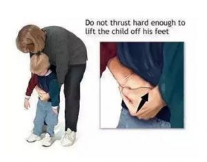 2、如果是3岁以上的儿童,抢救者站在患儿背后,用手臂绕其腰部,一手握拳,另一手将拳握住,将拳的拇指侧顶在患儿腹部正中线脐上,快速向内向上冲击腹部,直至异物咳出。